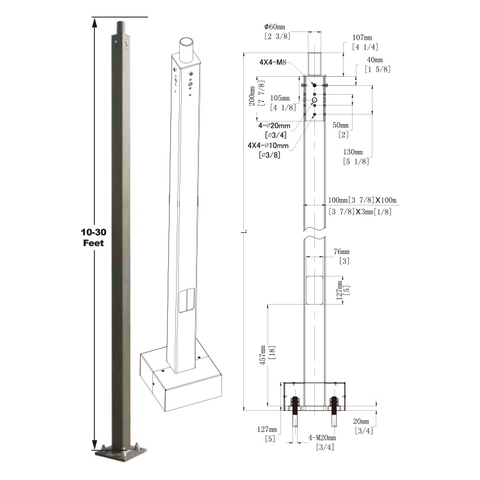 Giao hàng nhanh 20ft 4inch 11Gauge thẳng vuông thép ánh sáng cực mạ kẽm & sơn tĩnh điện cho khu vực Bãi đậu xe